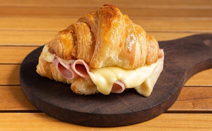 Αλείψτε το μείγμα βουτύρου σε κάθε πλευρά των κρουασάν και γεμίστε με ζαμπόν και τυρί και τοποθετήστε στο έτοιμο ταψί.