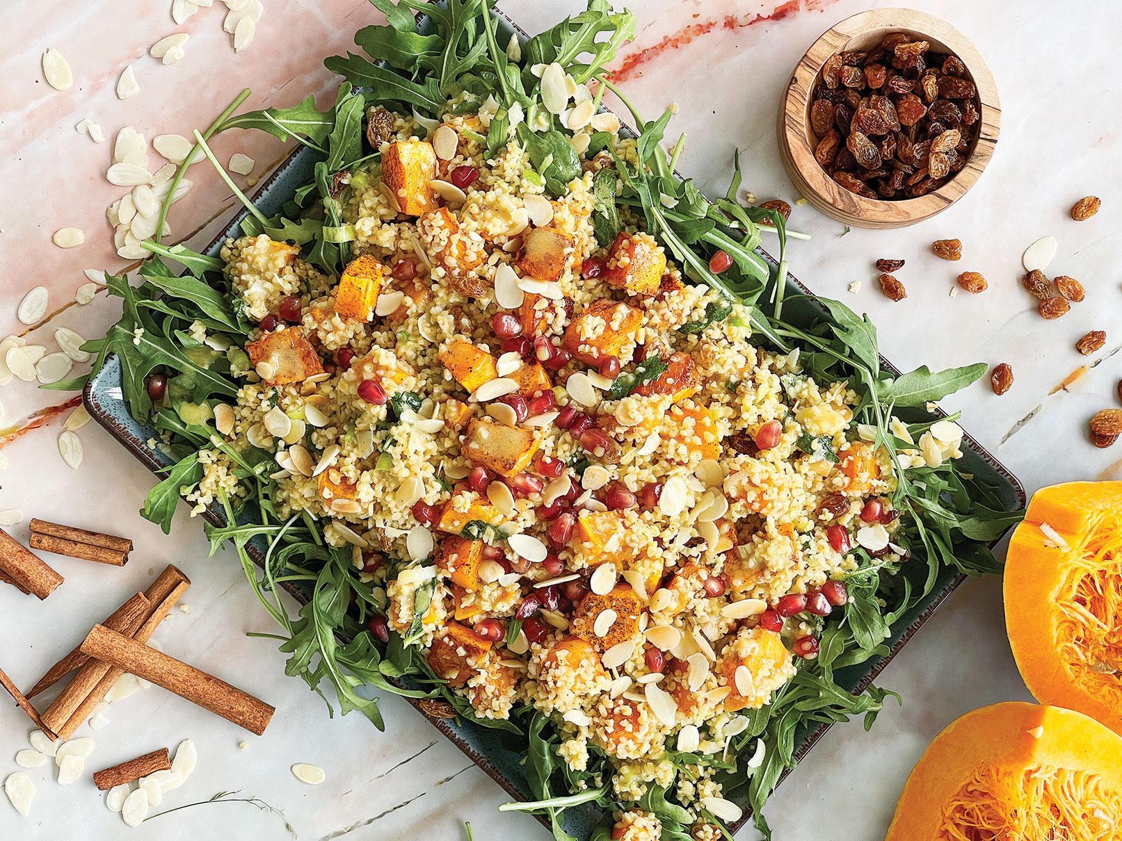 Βάζετε την ψημένη κολοκύθα στο μπολ με το πουργούρι. Προσθέτετε τα ρόδια, τις σταφίδες, τα αμύγδαλα το κρεμμυδάκι και το δυόσμο. Ανακατεύετε ελαφρά.