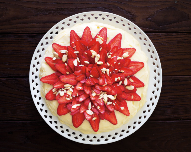 Όταν το παντεσπάνι κρυώσει, ανακατεύουμε μαζί το σιρόπι με το μπράντι και το περιλούζουμε. Βάζουμε από πάνω την κρέμα και γαρνίρουμε με τις φράουλες κομμένες σε φέτες και τα χοντροκοπανισμένα αμύγδαλα.