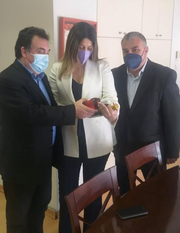 Η συζήτηση στράφηκε επίσης γύρω από τους γαστρονομικούς «θησαυρούς» της περιοχής, με τον κ. Αντωνακόπουλο να προσφέρει τοπικά προϊόντα και κρασί στην κ. Ζαχαράκη.