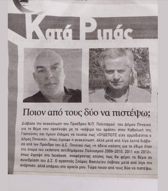 Ενώ ο Δημήτρης Βασιλόπουλος Πρόεδρος ΝΠ Πολιτισμού Δήμου Πηνειού ανέφερε σε μια απαξιωτική για πολλούς συνδημότες του ανακοίνωσή του ότι ο Δήμος δεν έχει αρμοδιότητα [διαβάστε εδώ… και εδώ…], ο Σπύρος Βασιλείου σε ανάρτησή του στο facebook [την οποία κατέβασε] ανέφερε ότι “η άδεια καύσης για το έθιμο ήταν στο όνομα του εκάστοτε αντιδημάρχου Πολιτισμού…”.