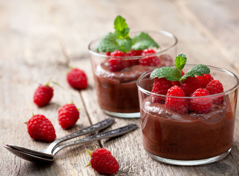 Λίγο πριν σερβίρετε, γαρνίρετε την κρέμα με φραμπουάζ, ή μικρές φράουλες, ή τεμαχισμένες φράουλες και φυλλαράκια δυόσμου.