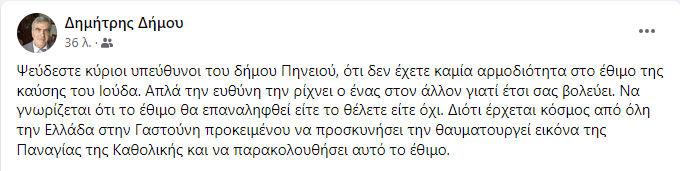Με κείμενό του που ανάρτησε πριν λίγο στην προσωπική του σελίδα στο facebook ο Δημήτρης Δήμου επιτίθεται στη δημοτική αρχή Πηνειού, αναφέροντας ότι ψεύδονται όταν λένε πώς δεν έχουν αρμοδιότητα στο έθιμο της καύσης του Ιούδα.