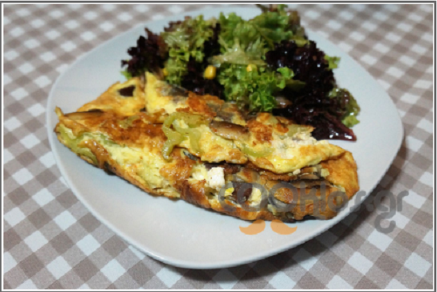 Μόλις η ομελέτα πάρει ένα απαλό χρυσαφί χρώμα από κάτω, τη γυρνάμε και αφήνουμε 1 λεπτό να ψηθεί και από την άλλη πλευρά.
