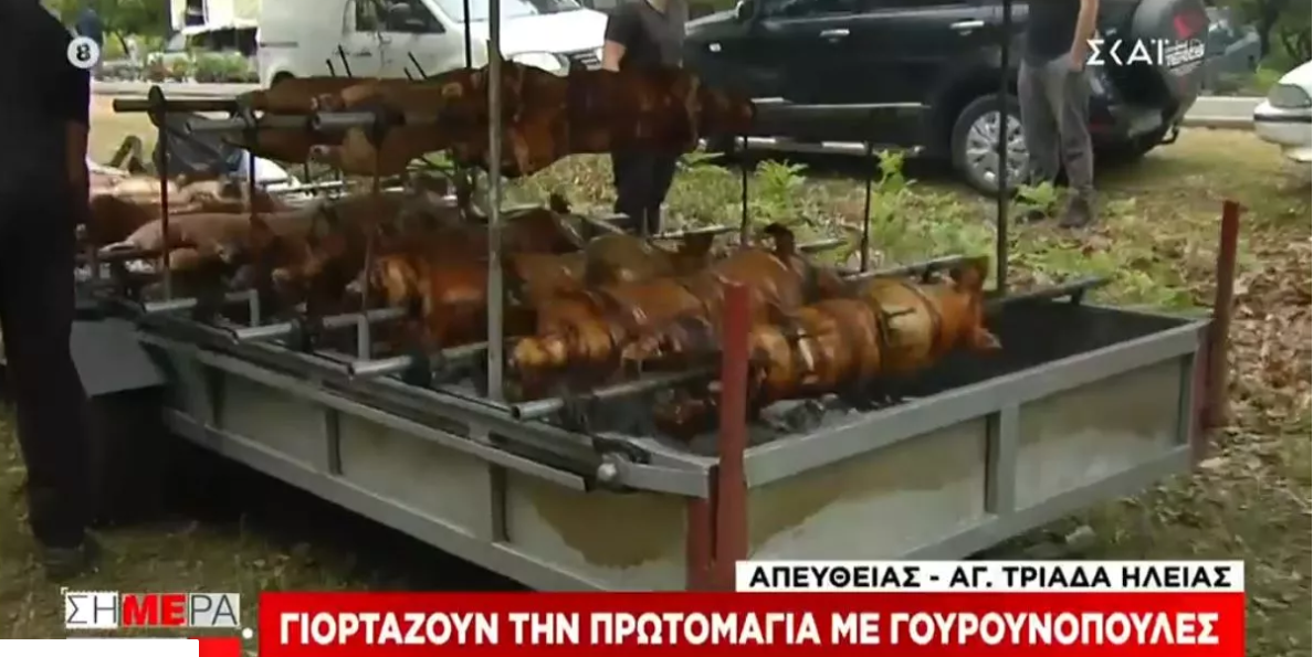Οι κάτοικοι στην Αγία Τριάδα στην Ηλεία έβαλαν από νωρίς το πρωί τις σούβλες με τις γουρουνοπούλες, όπως απαιτεί το έθιμο της Πρωτομαγιάς.