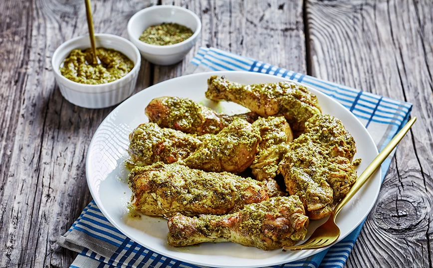 Αλείψτε τα φιλέτα κοτόπουλου με το πέστο από όλες τις πλευρές (περίπου 2 κουταλιές της σούπας πέστο για κάθε στήθος κοτόπουλου) και αλατοπιπερώστε.
