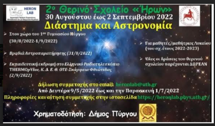 Το 2ο θερινό σχολείο «Ήρων» με θέμα «Διάστημα και Αστρονομία» για μαθητές/μαθήτριες Λυκείου (σχ. έτους 2022-2023) της Περιφερειακής Ενότητας Ηλείας, που συνδιοργανώνεται από το Ερευνητικό Εργαστήριο Υψηλών Συχνοτήτων, Μεταϋλικών και μη Γραμμικών Κυμάτων (HERON LAB) του Τμήματος Φυσικής του Πανεπιστημίου Θεσσαλίας και τον Δήμο Πύργου,