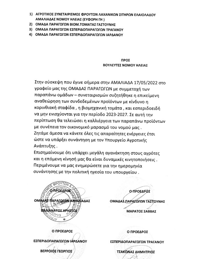Επιστολή στους βουλευτές Ηλείας από τις Ομάδες Παραγωγών του νομού