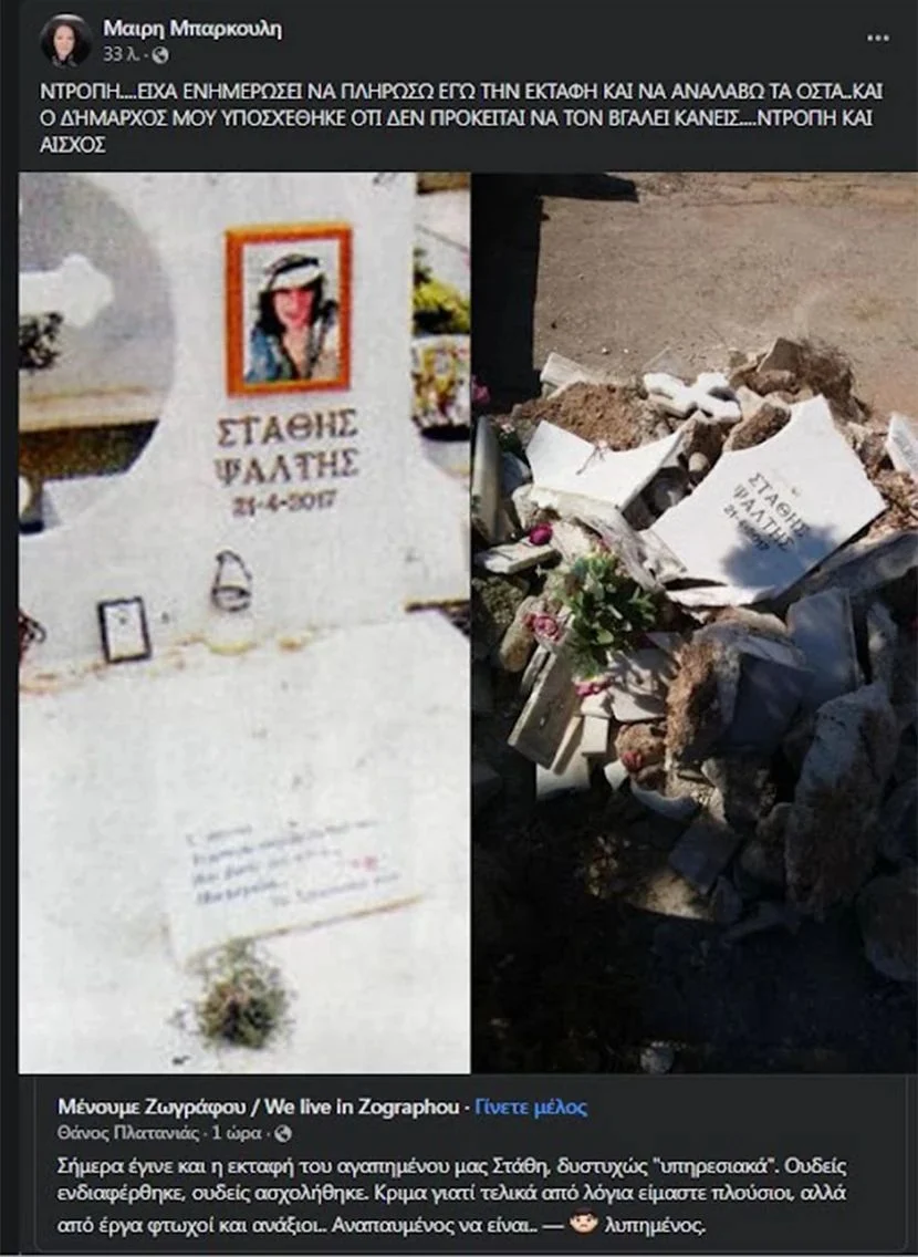 Την ανάρτηση αναδημοσίευσε η Μαρία Μπάρκουλη σχολιάζοντας ότι η ίδια είχε επικοινωνήσει με τον Δήμο: «Ντροπή… Είχα ενημερώσει να πληρώσω εγώ την εκταφή και να αναλάβω τα οστά. Και ο δήμαρχος μου υποσχέθηκε ότι δεν πρόκειται να τον βγάλει κανείς. Ντροπή και αίσχος» έγραψε.