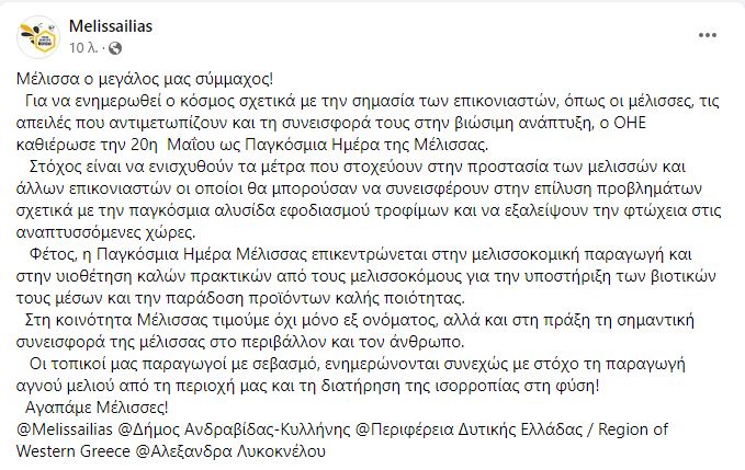 Για να ενημερωθεί ο κόσμος σχετικά με την σημασία των επικονιαστών, όπως οι μέλισσες, τις απειλές που αντιμετωπίζουν και τη συνεισφορά τους στην βιώσιμη ανάπτυξη, ο ΟΗΕ καθιέρωσε την 20η Μαΐου ως Παγκόσμια Ημέρα της Μέλισσας.