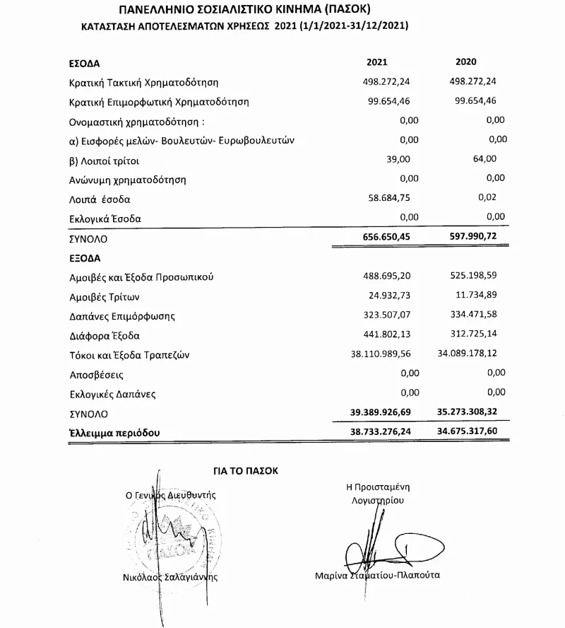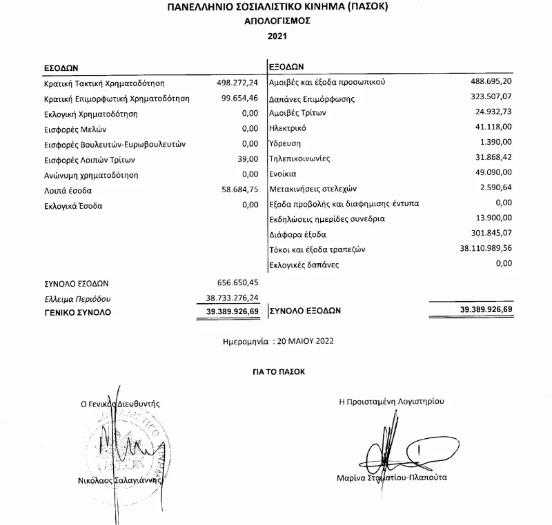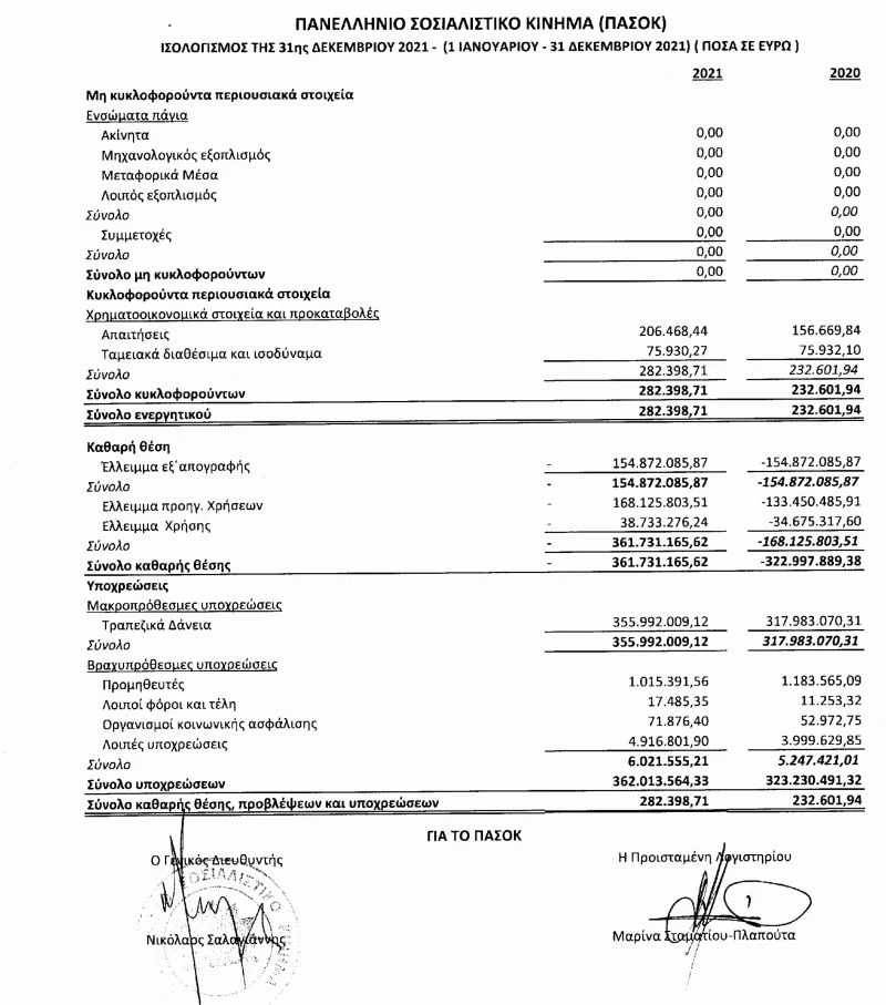 Τα στοιχεία αναφέρονται στον ισολογισμό του 2021, ο οποίος δημοσιεύτηκε στις 20 Μαΐου, και τον οποίο υπογράφει ο γενικός διευθυντής του κόμματος Νίκος Σαλαγιάννης, πρώην υπουργός. Χρέη που προκαλούν ίλιγγο και μόνο που διαβάζεις το ύψος τους και τα