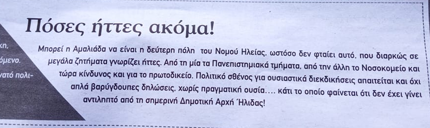 Την… ‘τιμητική της είχε σήμερα η δημοτική αρχή Ηλιδας και συγκεκριμένα δήμαρχος και αναπληρωτής δήμου Ηλιδας στην εφημερίδα “ΠΡΩΤΗ”.
