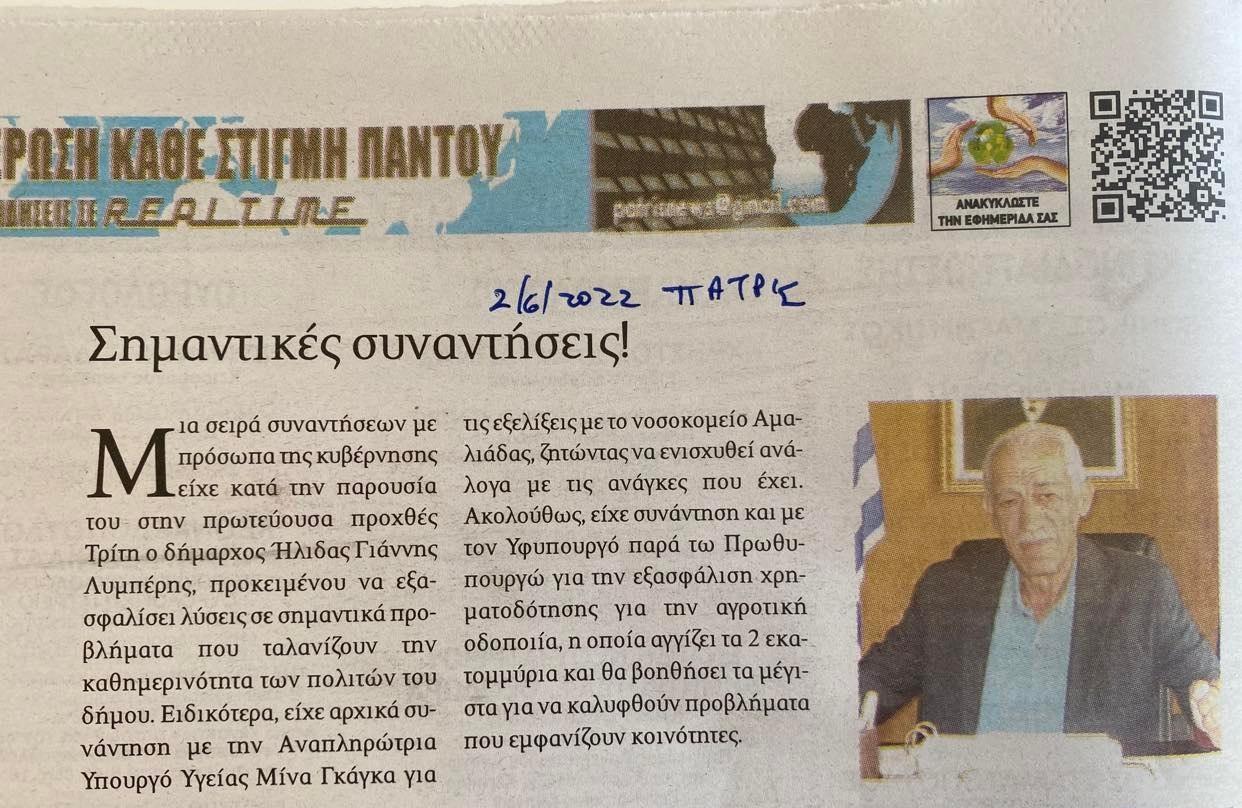 Σημαντικές, έγραψε η εφημ. Πατρίς, επαφές του δημάρχου Ηλιδας Γιάννη Λυμπέρη στην Αθήνα για να… λύσει προβλήματα που ταλανίζουν την καθημερινότητα των πολιτών.