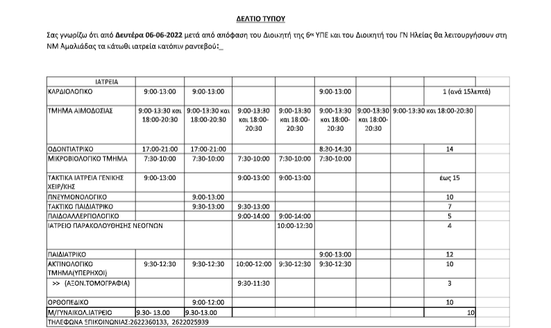 Με σκοπό την καλύτερη εξυπηρέτηση των πολιτών της ευρύτερης περιοχής της Αμαλιάδας, από τις 6 Ιουνίου θα λειτουργήσουν στο Νοσοκομείο Αμαλιάδας τα κάτωθι ιατρεία κατόπιν ραντεβού: