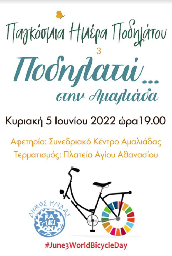 Ο Δήμος Ήλιδας στο πλαίσιο του εορτασμού της Παγκόσμιας Ημέρας Ποδηλάτου 3 Ιουνίου 2022, διοργανώνει ποδηλατοδρομία ΠΟΔΗΛΑΤΩ… ΣΤΗΝ ΑΜΑΛΙΑΔΑ την Κυριακή 5 Ιουνίου και ώρα 7 το απόγευμα. Γονείς και παιδιά, μικροί και μεγάλοι παίρνουν το ποδήλατο τους και «ποδηλατούν στην Αμαλιάδα», σε μια όμορφη διαδρομή μέσα στην πόλη.