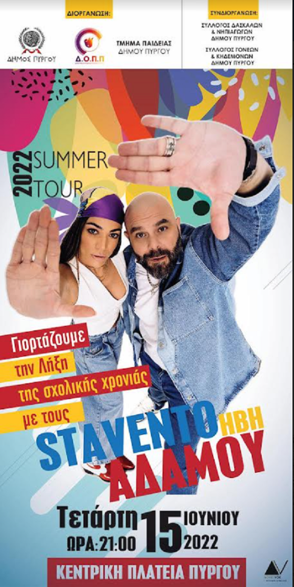 Με τον πιο ρυθμικό και μουσικό τρόπο θα γιορτάσει ο Δήμος Πύργου μαζί με όλα τα παιδιά της πόλης, τη λήξη της φετινής σχολικής χρονιάς. Μαζί με τον ΔΟΠΠ και το Τμήμα Παιδείας διοργανώνουν μια ξεχωριστή συναυλία, ανοιχτή σε όλους, με τους Stavento και την Ήβη Αδάμου την Τετάρτη 15 Ιουνίου και ώρα 21.00 στην κεντρική πλατεία του Πύργου.