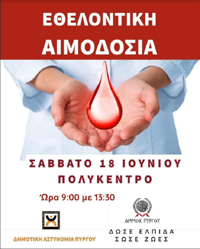 πρωτοβουλία προσφοράς και αλληλεγγύης και διοργανώνει για άλλη μια φορά εθελοντική αιμοδοσία το προσεχές Σάββατο 18 Ιουνίου 2022, στο Πολύκεντρο του Δήμου Πύργου, από τις 09.00 έως και τις 13.00.