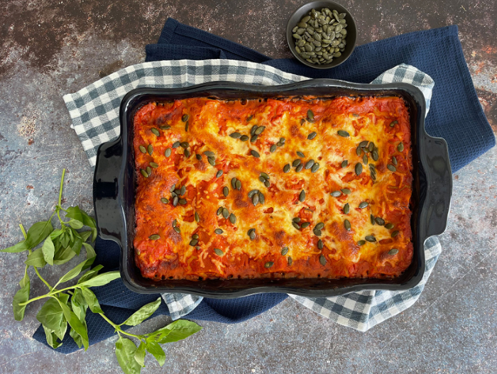 Επαναλαμβάνουμε άλλες 3 φορές. Τελειώνουμε με 4 φύλλα λαζάνια, ¾ φλιτζ. σος ντομάτας και πασπαλίζουμε με μοτσαρέλα.