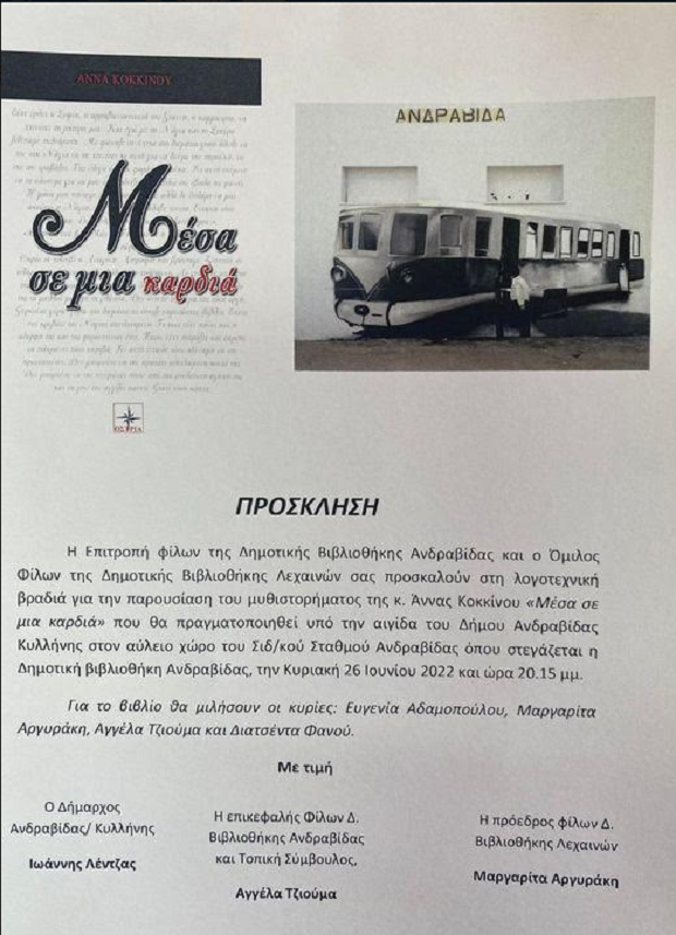 Η Επιτροπή Φίλων της Δημοτικής Βιβλιοθήκης Ανδραβίδας και ο Όμιλος Φίλων της Δημοτικής Βιβλιοθήκης Λεχαινών σας προσκαλούν στη λογοτεχνική βραδιά για την παρουσίαση του μυθιστορήματος της κ. Άννας Κοκκίνου «Μέσα σε μια καρδιά» που θα πραγματοποιηθεί υπό την αιγίδα του Δήμου Ανδραβίδας – Κυλλήνης στον αύλειο χώρο του Σιδηροδρομικού Σταθμού Ανδραβίδας όπου στεγάζεται η Δημοτική Βιβλιοθήκη Ανδραβίδας, την Κυριακή 26 Ιουνίου 20022 και ώρα 20:15 μ.μ.