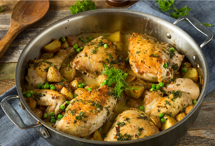 Προθερμαίνετε το φούρνο στους 220⁰C. Ζεσταίνετε σε μέτρια φωτιά 1-2 κουταλιές ελαιόλαδο σε ένα μεγάλο (διαμέτρου 35 εκ. περίπου), βαρύ ταψί/τηγάνι με χερούλια (που να μπαίνει στο φούρνο), αν έχετε. Εναλλακτικά χρησιμοποιείτε ένα πολύ μεγάλο βαρύ τηγάνι. Κοκκινίζετε μέσα τα κομμάτια του κοτόπουλου, μέχρι να ροδίσουν από όλες τις πλευρές, για 8-10 περίπου λεπτά, γυρίζοντάς τα στο μέσο του ψησίματος στα 4-5 λεπτά. Τα βγάζετε σε μια πιατέλα.