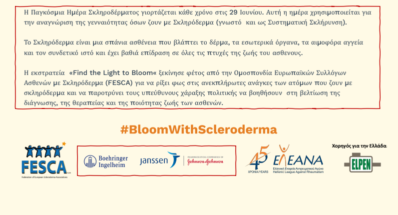 Για να αυξήσουν την ευαισθητοποίηση σχετικά με το Σκληρόδερμα (γνωστό και ως συστημική σκλήρυνση ή SSc), η FESCA και η ΕΛΕΑΝΑ στην χώρα μας ξεκινούν εκστρατεία με τίτλο «Find the Light to Bloom»(Βρες το φως να ανθίσεις) με σκοπό να τονίσουν τις ανεκπλήρωτες ανάγκες των ατόμων που ζουν με Σκληρόδερμα και να παροτρύνουν τους υπεύθυνους χάραξης πολιτικής να θέσουν ως προτεραιότητα τη βελτίωση της διάγνωσης, της θεραπείας και της ποιότητας ζωής των ασθενών με Σκληρόδερμα. Το έγγραφο θέσης (Position Paper) με τίτλο «Χωρίς διάγνωση και χωρίς θεραπεία: Η πραγματικότητα για τη Συστημική Σκλήρυνση/Σκληρόδερμα στην Ευρώπη σήμερα» εξηγεί ότι, παρά το γεγονός ότι είναι γνωστό στους ρευματολόγους σε όλη την ΕΕ, το Σκληρόδερμα είναι σχετικά «αόρατο» στην ευρωπαϊκή κοινότητα των γενικών γιατρών και των υπαλλήλων δημόσιας υγείας.
