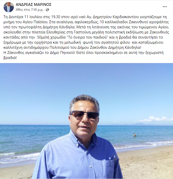 Την ανακοίνωση έκανε ο δήμαρχος Πηνειού, Ανδρέας Μαρίνος, στην προσωπική του σελίδα στο facebook.