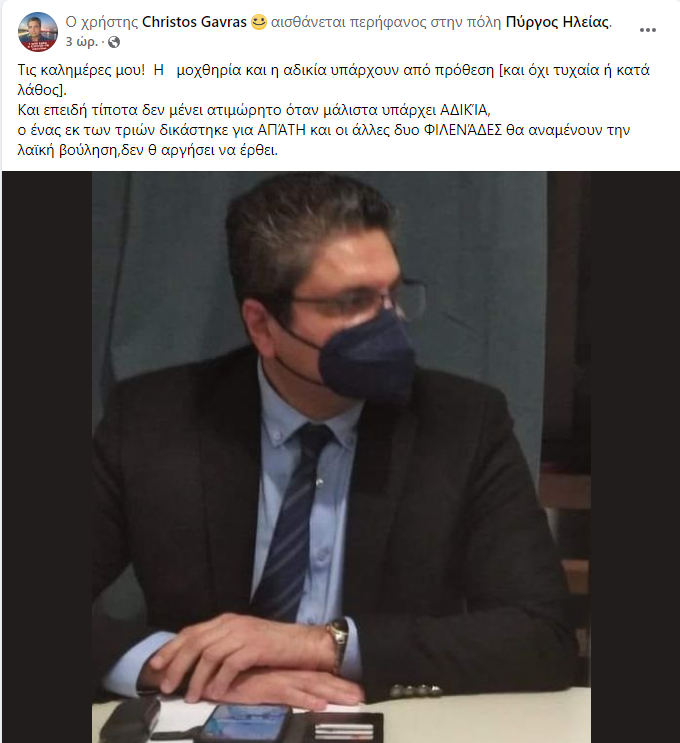 Μήνυμα σε συγκεκριμένους αποδέκτες έστειλε μέσω της προσωπικής του σελίδας στο facebook, ο πρώην πρόεδρος της ΔΕΕΠ Ηλείας Χρήστος Γαβράς.