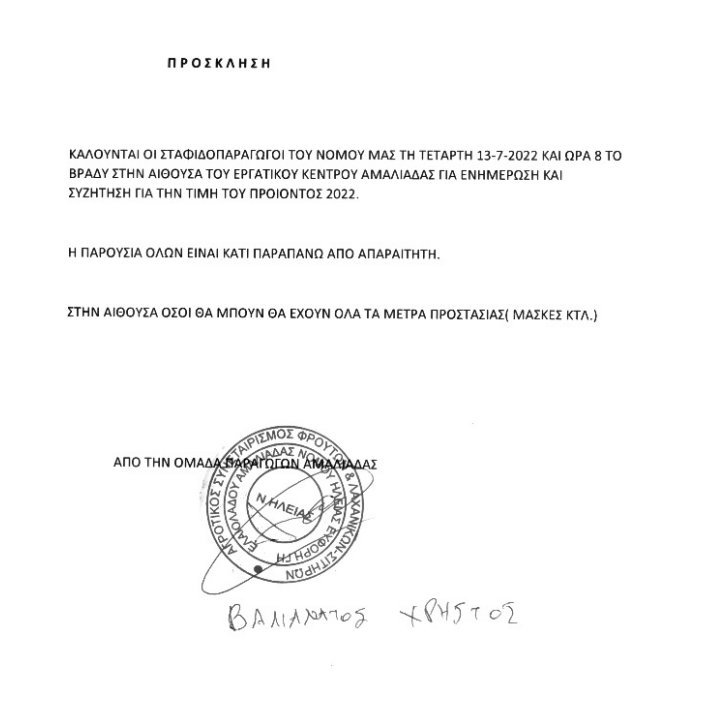 “Μετά τη συνάντηση που είχαμε την περασμένη Παρασκευή στη ΣΚΟΣ στη Πάτρα, η Παναιγιάλειος είχε προτείνει 1,5 ευρώ το κιλό για την σταφίδα του 2022. Οι ιδιώτες έμποροι συμφώνησαν προφορικά όλοι, αλλά όταν ήρθε η ώρα να υπογράψουν και να αποδεχτούν την πρόταση, σηκώθηκαν κι έφυγαν. Δεν υπόγραψε κανένας. Εμείς, βλέποντας αυτή την κατάσταση, βλέποντας πώς πάλι οι έμποροι πάνε να ρίξουν τις τιμές, για αύριο Τετάρτη 13 του μηνός, καλούμε όλους τους σταφιδοπαραγωγούς στις 8.00′ το βράδυ στο Εργατικό Κέντρο Αμαλιάδος. Δεν πρέπει να λείψει κανένας, το θέμα είναι σοβαρό γιατί αν και φέτος πέσει η τιμή τελείωσαν οι σταφίδες. Θα αρχίσουν να ξεριζώνονται”.