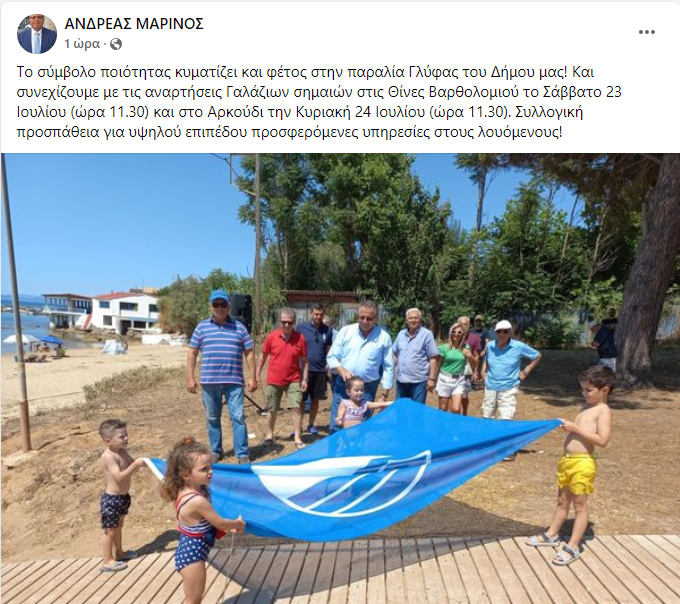 Σήμερα το πρωί, στη παραλία της Γλύφας, σε μια σεμνή τελετή, αναρτήθηκε η Γαλάζια Σημαία, σύμβολο ποιότητας, όπως σωστά την χαρακτήρισε ο δήμαρχος Πηνειού Ανδρέας Μαρίνος, σε ανάρτησή του.