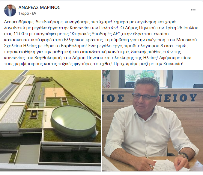 Ο Δήμαρχος Πηνειού κ. Ανδρέας Μαρίνος σε ανάρτησή του στο προσωπικό του προφίλ αναφέρει τα εξής: “Δεσμευθήκαμε, διεκδικήσαμε, κυνηγήσαμε, πετύχαμε! Σήμερα με συγκίνηση και χαρά, λογοδοτώ με μεγάλα έργα στην Κοινωνία των Πολιτών! Ο Δήμος Πηνειού την Τρίτη 26 Ιουλίου στις 11.00 π.μ υπογράφει με τις “Κτιριακές Υποδομές ΑΕ” ,στην έδρα του ενιαίου
