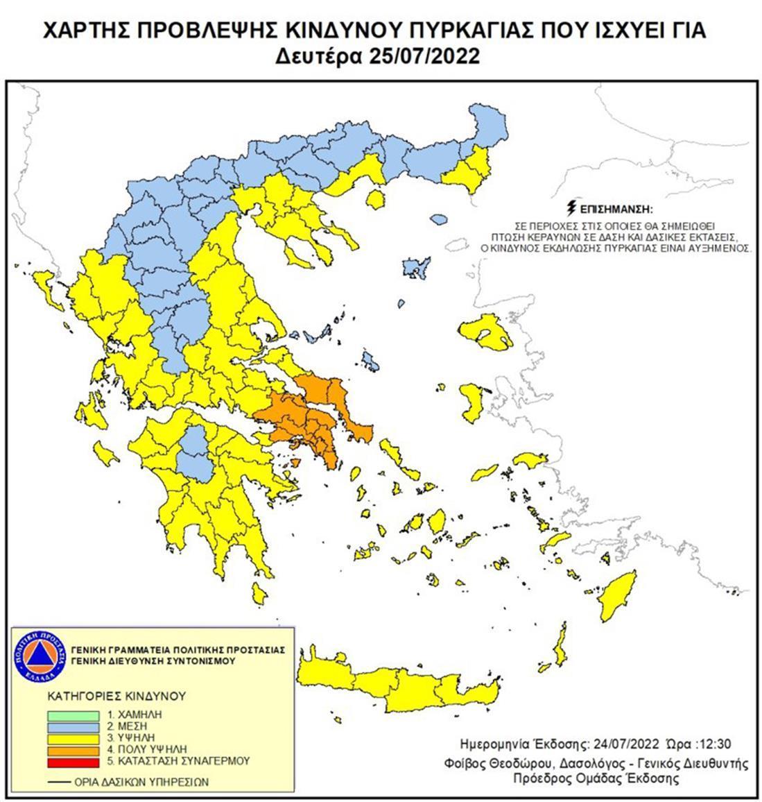 Σύμφωνα με τον Χάρτη Πρόβλεψης Κινδύνου Πυρκαγιάς που εκδίδει η Γενική Γραμματεία Πολιτικής Προστασίας του υπουργείου Κλιματικής Κρίσης και Πολιτικής Προστασίας (www.civilprotection.gr), και για σήμερα Δευτέρα 25 Ιουλίου, προβλέπεται πολύ υψηλός κίνδυνος πυρκαγιάς (κατηγορία κινδύνου 4).