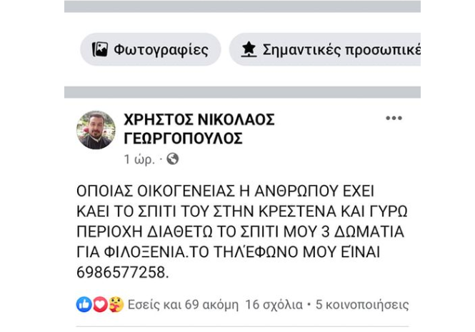 Ευαισθητοποιημένος από την πύρινη λαίλαπα που έπληξε και πάλι τον δήμο Ανδρίτσαινας-Κυλλήνης, ανέβασε στον προσωπικό του λογαριασμό ένα ποστ με το οποίο ανακοινώνει πώς διαθέτει τρία δωμάτια του σπιτιού του για να φιλοξενήσει οικογένεια που επλήγη από τις πυργκαγιές.