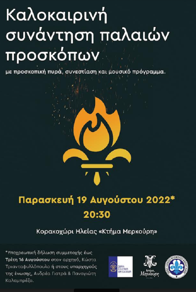 Τις προσεχείς ημέρες θα γίνει η καθιερωμένη ,πλέον των 10 χρόνων,Καλοκαιρινή Συνάντηση των διατελεσάντων Προσκόπων με την ονομασία ”Πυράς..Μνήμες 2022”.