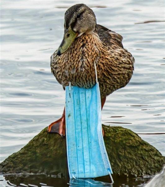 Σχεδόν το ένα τέταρτο των φωτογραφιών δείχνουν πτηνά με μάσκες προσώπου μιας χρήσης, τυλιγμένες στο λαιμό τους.