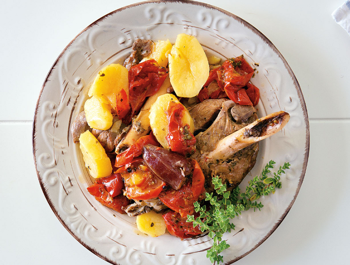 Βάζουμε το ελαιόλαδο σε κατσαρόλα, μετά τις πατάτες, στη συνέχεια το κρέας κι από πάνω τις ντομάτες. Προσθέτουμε το χυμό λεμονιού, το αλάτι, το πιπέρι, τη ρίγανη και το νερό. Σκεπάζουμε και ψήνουμε σε μέτρια φωτιά για 2 1/2 περίπου ώρες.