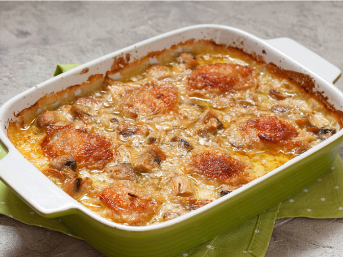 Βάζετε το ταψί στο φούρνο και ψήνετε το κοτόπουλο για 35 περίπου λεπτά (ελέγχετε αν έχει ψηθεί κόβοντας λίγο ένα κομμάτι με μαχαιράκι). Το σερβίρετε, αν θέλετε, με ρύζι, ή πουρέ πατάτας.
