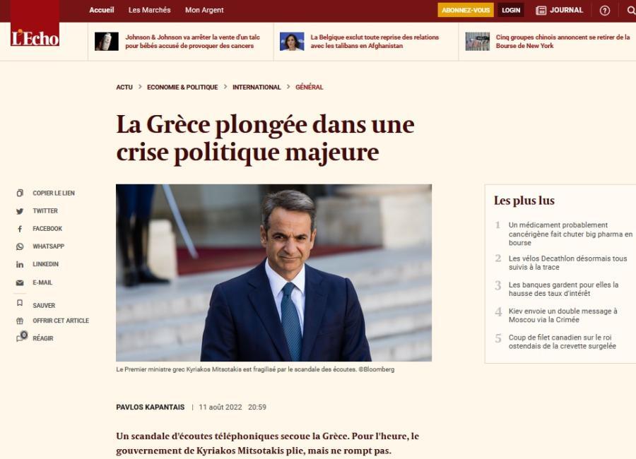 Τον διεθνή διασυρμό της κυβέρνησης Μητσοτάκη επιβεβαιώνει σε εκτενές ρεπορτάζ της η βελγική εφημερίδα L’Echo αναφορικά με το σκάνδαλο των παρακολουθήσεων που συγκλονίζει Ελλάδα και Ευρώπη. Μεταξύ άλλων στο ρεπορτάζ της με τίτλο «Η Ελλάδα βυθίζεται σε μεγάλη πολιτική κρίση», η εφημερίδα διερωτάται «πόσο ακόμα μπορεί να αντέξει η ελληνική κυβέρνηση», ενώ κάνει αναφορά και στη χούντα.