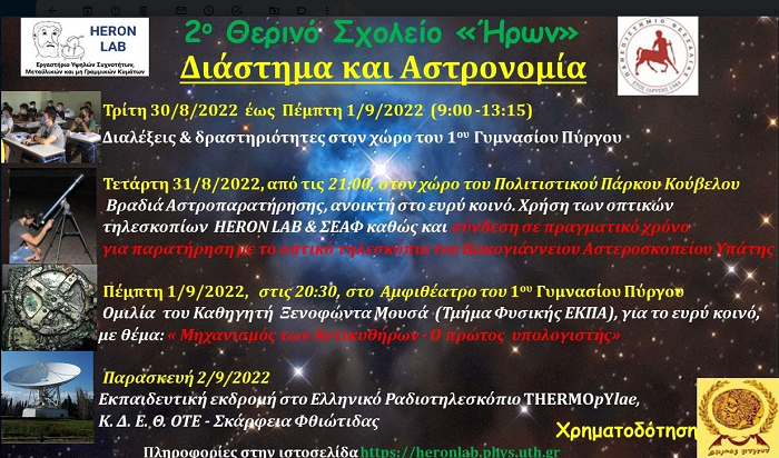 Ξεκινά την Τρίτη 30 Αυγούστου και θα ολοκληρωθεί την Παρασκευή 2 Σεπτεμβρίου το 2 ο θερινό σχολείο «ΗΡΩΝ» με θέμα «Διάστημα και Αστρονομία», για μαθητές/μαθήτριες Λυκείου, που συνδιοργανώνεται από το Ερευνητικό Εργαστήριο Υψηλών Συχνοτήτων, Μεταϋλικών και μη Γραμμικών Κυμάτων (HERON LAB) του Τμήματος Φυσικής του Πανεπιστημίου Θεσσαλίας