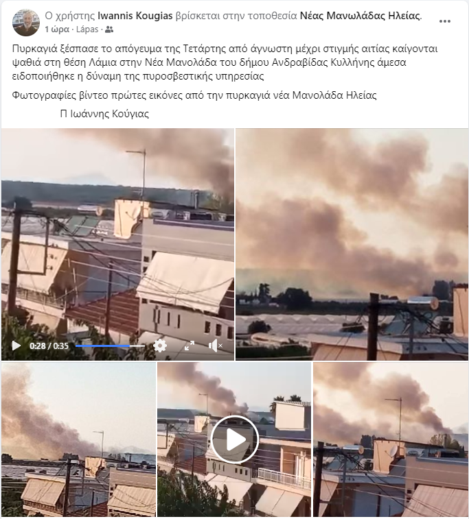 Πυρκαγιά ξέσπασε σήμερα το απόγευμα στη Μανολάδα, από άγνωστη μέχρι στιγμή αιτία.