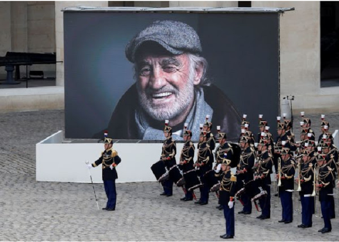 Οι νεκροπομποί μετέφεραν το φέρετρο του Ζαν-Πολ Μπελμοντό, καλυμμένο με τη γαλλική σημαία, στην αυλή του στρατιωτικού μουσείου των Απομάχων, όπου είναι θαμμένος ο Ναπολέοντας, για την επίσημη τελετή.