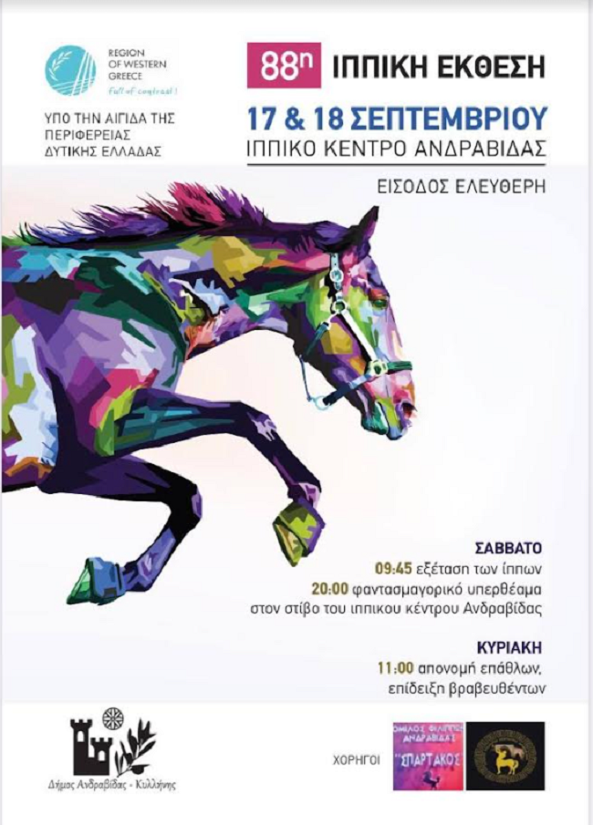 Υπό την αιγίδα της Περιφέρειας Δυτικής Ελλάδας, με διοργάνωση από τον Δήμο Ανδραβίδας-Κυλλήνης και χορηγούς τον Όμιλο Φιλίππων Ανδραβίδας «Σπάρτακος» και τον Ιππικό Σύλλογο «Κένταυροι» Ανδραβίδας, η Ιππική Έκθεση Ανδραβίδας συμπληρώνει φέτος τα 88 χρόνια ζωής και σας προσκαλεί να την τιμήσετε με την παρουσία σας!