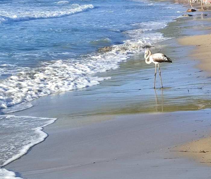 Ένα φλαμίνγκο… μόνο του βρίσκεται στην παραλία του Λεβεντοχωρίου.