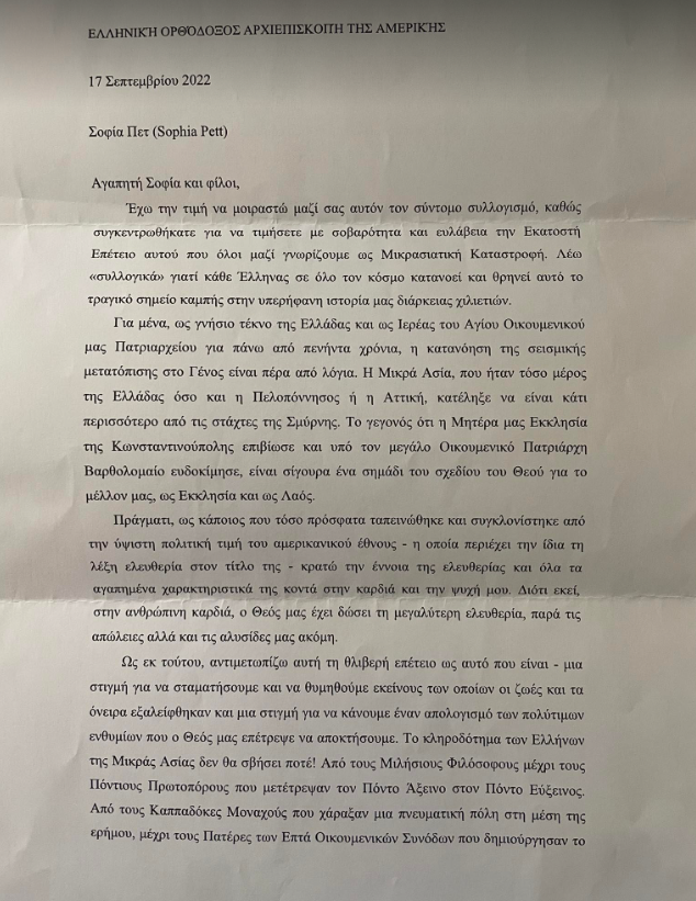 Επιστολή στο Πρωτοπρεσβύτερο του Οικουμενικού Πατριαρχείου Πατέρα Αλέξανδρο Καρλούτσο στην οποία ζητάει να παραβρεθεί στις διήμερες εορταστικές εκδηλώσεις μνήμης Μικρασιατικής Καταστροφής απέστειλε η πρόεδρος της ΤΟ Πηνειού Σοφία Πέττα