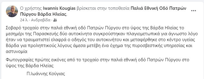 Σοβαρό τροχαίο στην παλιά εθνική οδό Πατρών Πύργου στο ύψος της Βάρδας σημειώθηκε σήμερα μεσημέρι της Παρασκευής.