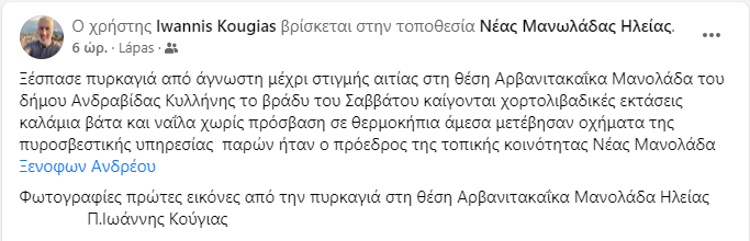 Πυρκαγιά ξέσπασε από άγνωστη μέχρι στιγμής αιτίας στη θέση Αρβανιτακαΐκα Μανολάδας του δήμου Ανδραβίδας Κυλλήνης το βράδυ του Σαββάτου καίγονται χορτολιβαδικές εκτάσεις καλάμια βάτα και ναΐλα, όπως αναφέρει ο π. Ιωάννης Κούγιας στην προσωπική του σελίδα στο facebook.