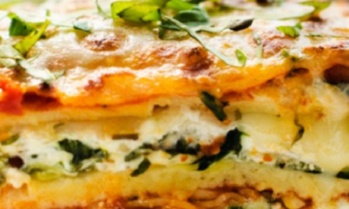 Στη συνέχεια βάζουμε δεύτερη στρώση λαζάνια, μετά τα τριμμένα κολοκυθάκια, μείγμα κρεμμυδιών και ανθότυρο. Ακολουθεί τρίτη στρώση λαζάνια, κολοκυθάκια, μείγμα κρεμμυδιών, ανθότυρο και τέλος τέταρτη στρώση λαζάνια, λίγο από το μείγμα κρεμμυδιών που αφήσαμε, λίγη φέτα και από πάνω γκούντα. Ψήνουμε στους 180 βαθμούς για 45 λεπτά.