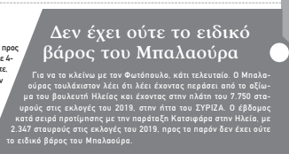 Για να το κλείνω με τον Φωτόπουλο, κάτι τελευταίο. Ο Μπαλαούρας τουλάχιστον λέει ότι λέει έχοντας περάσει από το αξίωμα του βουλευτή Ηλείας και έχοντας στην πλάτη του 7.750 σταυρούς στις εκλογές του 2019, στην ήττα του ΣΥΡΙΖΑ. Ο έβδομος κατά σειρά προτίμησης με την παράταξη Κατσιφάρα στην Ηλεία, με 2.347 σταυρούς στις εκλογές του 2019, προς το παρόν δεν έχει ούτε το ειδικό βάρος του Μπαλαούρα.