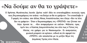 Ο Χρήστος Φωτόπουλος λοιπόν, βρήκε καλή ιδέα να επαναλαμβάνει συνεχώς προς τους δημοσιογράφους την ατάκα: «να δούμε αν θα το γράψετε». Την επανέλαβε 4-5 φορές την ατάκα, σαν άλλος Νίκος Αναστόπουλος που έλεγε «δεν τα λέτε, δεν τα γράφετε». Όταν ο δημοσιογράφος της «ΠΡΩΤΗΣ» του ζήτησε τον λόγο, άρχισε τα… «δεν αναφερόμουν σε εσένα». Μάλιστα, προς τιμήν του, ο Κώστας Διαμαντόπουλος του είπε πως ο Τύπος της Ηλείας «τα γράφει για το Νοσοκομείο». Οι αναγνώστες φυσικά μπορούν να κρίνουν, ειδικά σε ότι αφορά την «ΠΡΩΤΗ» εάν ασχολείται με το μείζον θέμα της Δημόσιας Υγείας στην Ηλεία.