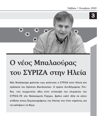 Νέο Μπαλαούρα φαίνεται πως απέκτησε ο ΣΥΡΙΖΑ στην Ηλεία στο πρόσωπο του Χρήστου Φωτόπουλου. Ο πρώην Αντιδήμαρχος Ήλιδας, που συμμετείχε χθες στην επίσκεψη του κλιμακίου του ΣΥΡΙΖΑ-ΠΣ στο Νοσοκομείο Πύργου, βρήκε καλή ιδέα να κάνει