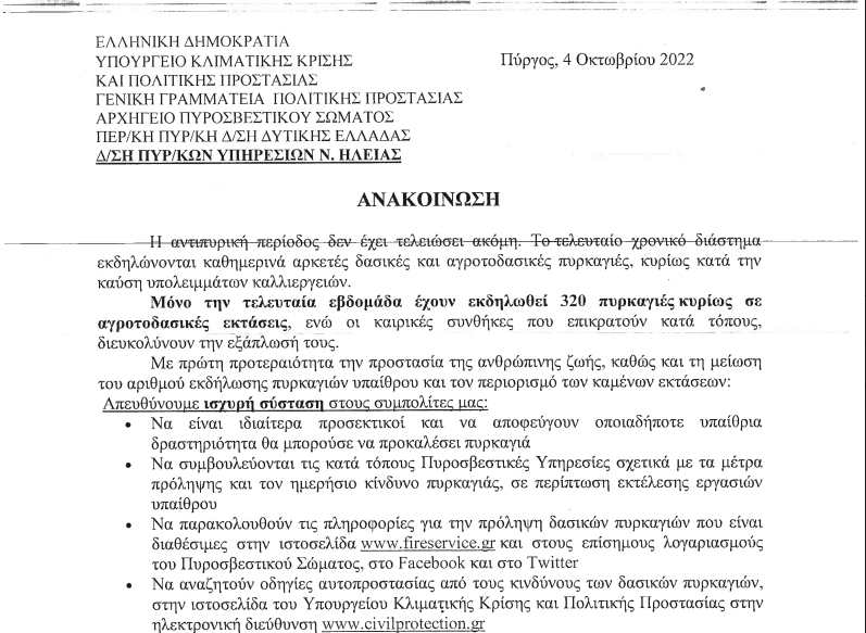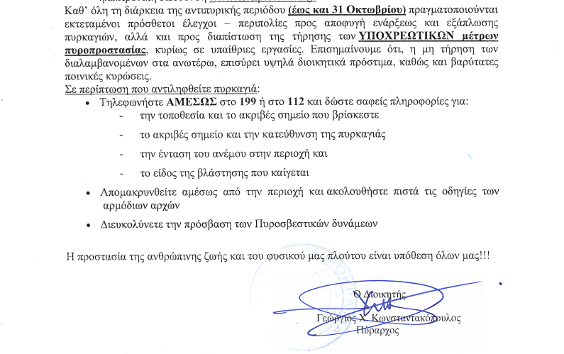 Σε ανακοίνωση για το γεγονός ότι η αντιπυρική περίοδος ΔΕΝ έχει ακόμα τελειώσει, προχώρησε ο Διοικητής της Πυροσβεστικής Υπηρεσίας, Πύραρχος Γεώργιος Κωνσταντακόπουλος.